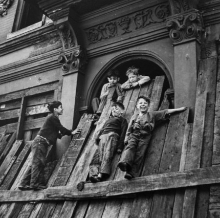 Boys playing at abandoned building, New York City