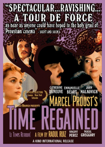 “Time Regained” does not tell a story, and you will be disappointed if you go looking for one. It does not contain anything like all of Remembrance of Things Past, because the novel is too vast to be contained in a film. It is not about memories but memory. Yours, mine, Proust’s. Memory makes us human. Without it, we would live trapped inside the moving dot of time as it slides through our lives. But to remember the past is to experience its loss. — Roger Ebert