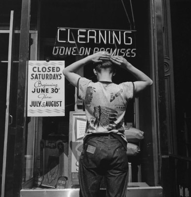 0 2024-02-282024-02-24 Written by Pop9 A teenager combing his hair in the window of a cleaners shop, New York