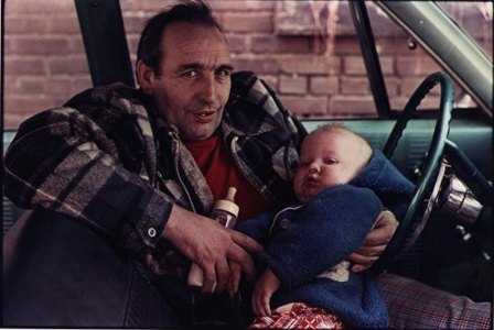 Man in red shirt in car with baby.