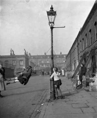Two girls swinging around a lamppost