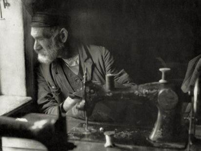 Aron Nohhem at his sewing machine, Kutno, Poland.